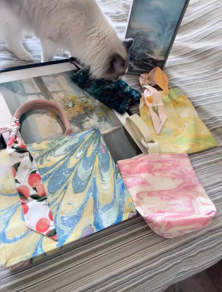 Thank you so much for your message and for your strong interest in my marbled lacquer bags! I was truly delighted and honored to hear that you are considering them as gifts for your employees.